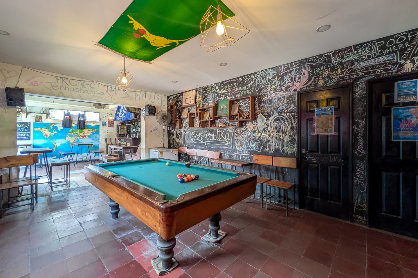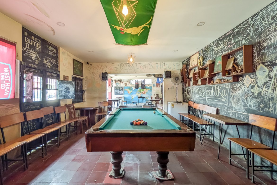 The bar and dining area seats 40 comfortably, while the billiards lounge—with a recently refurbished pool table—draws a mix of locals, expats, backpackers, and tourists. As one of the few pool tables in town, it’s a consistent draw and a reliable source of repeat business. Two large flatscreen TVs bring in additional crowds for sports and special events, adding to the steady flow of customers.