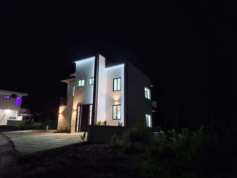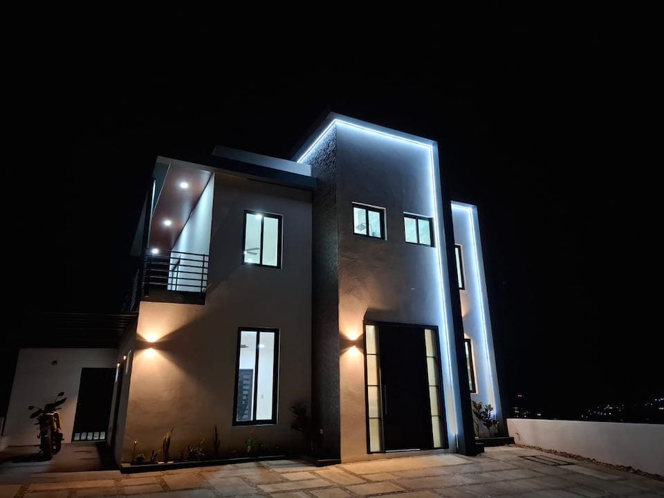 Exterior LED lighting highlighting the home’s façade beautifully at night