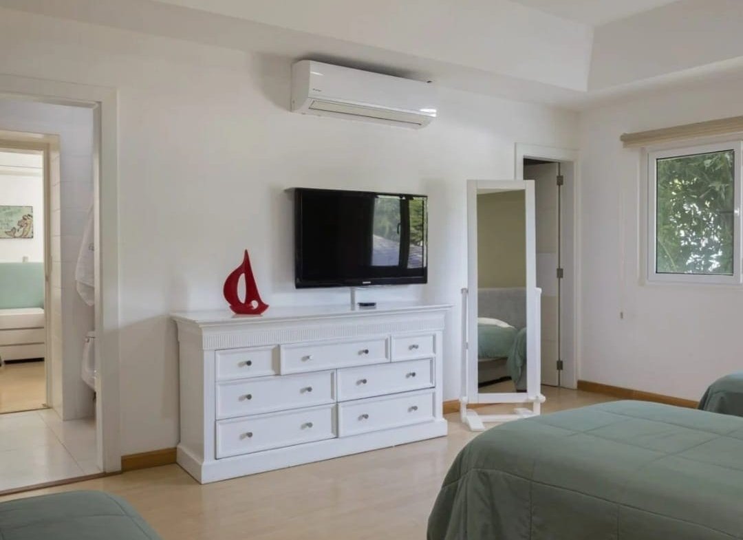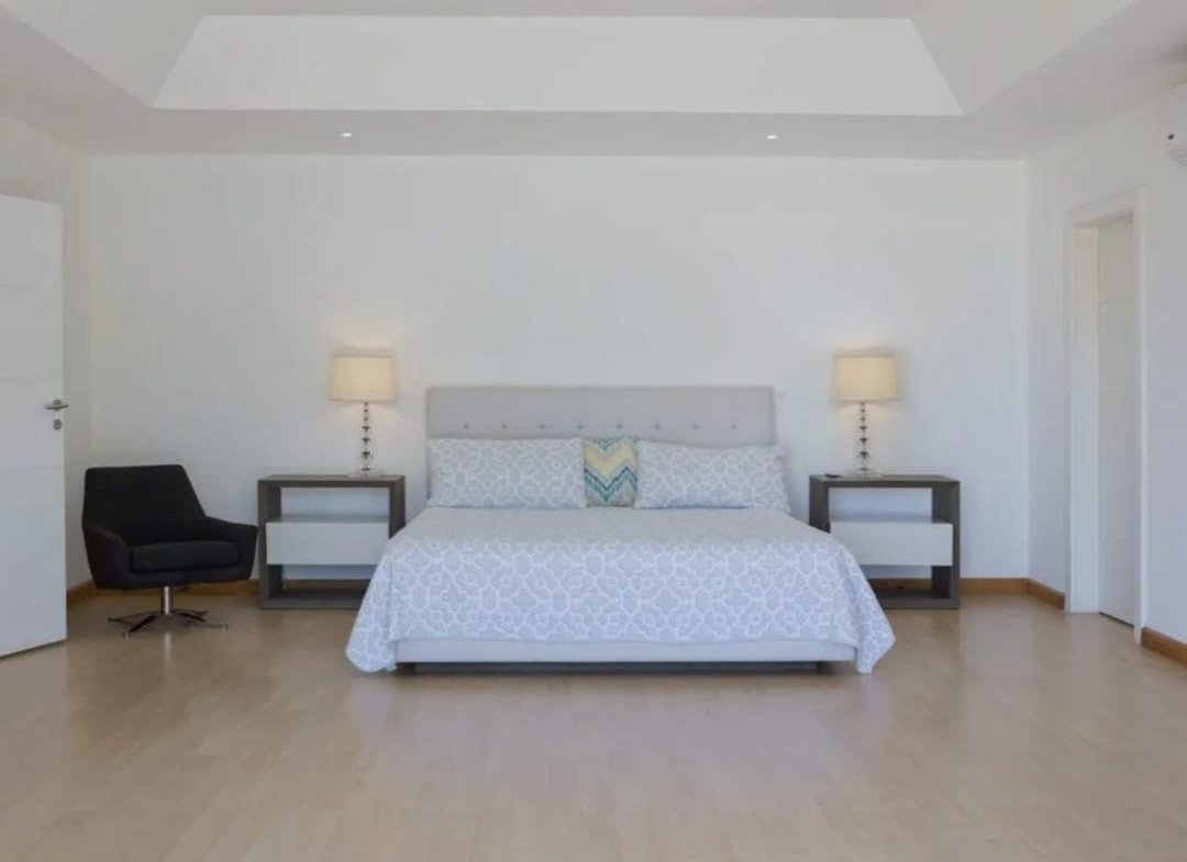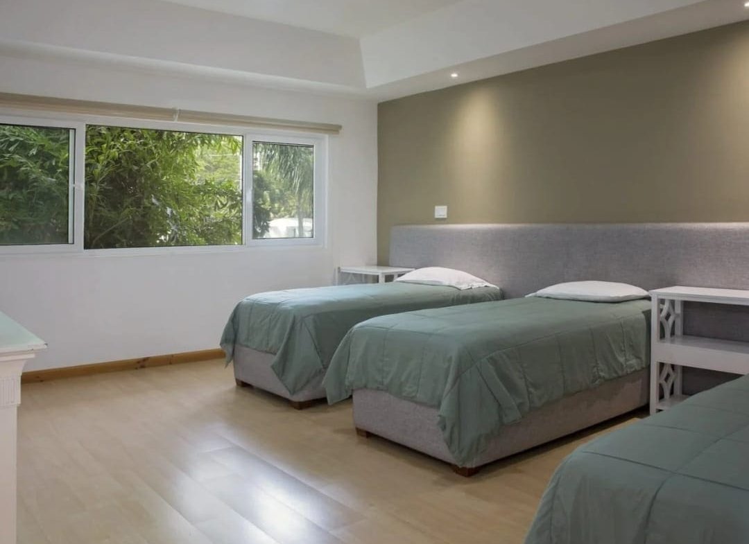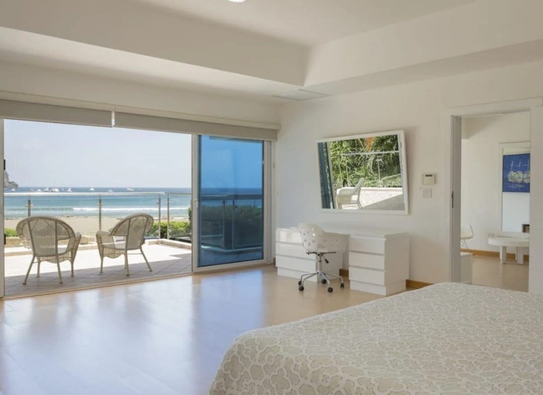 Casa Serena Beachfront Home boasts five uniquely designed bedrooms, each offering a luxurious retreat. The three master suites have king-sized beds, ensuite bathrooms, air conditioning, walk-in closets, and custom furniture. Two master bedrooms feature private balconies with breathtaking ocean views, providing a serene space to unwind. The additional two bedrooms are perfect for younger guests, with single beds, walk-in closets, air conditioning, and a shared bathroom.