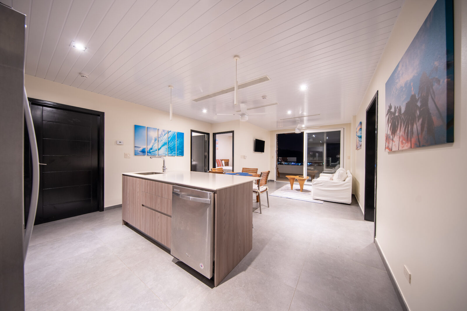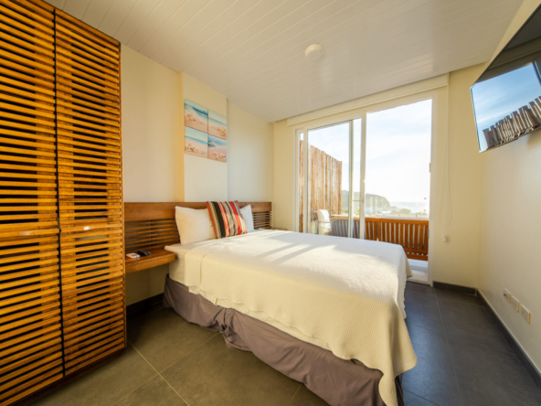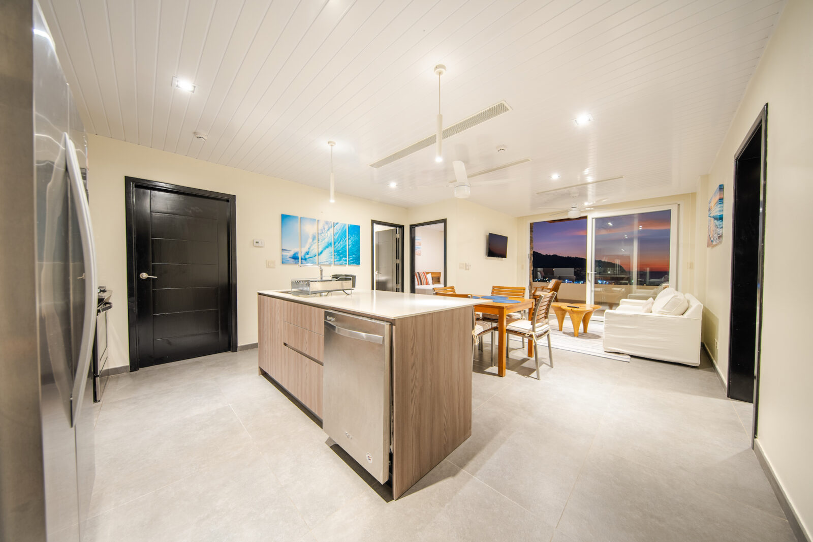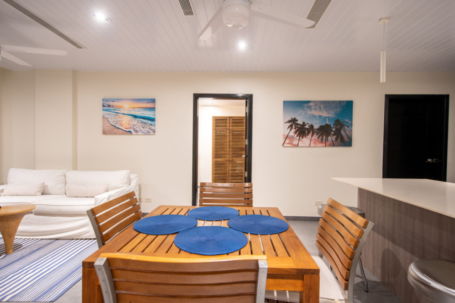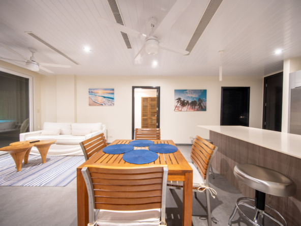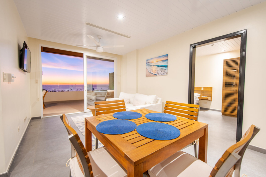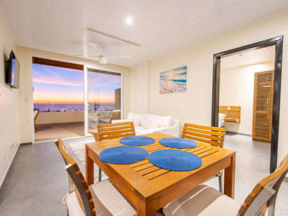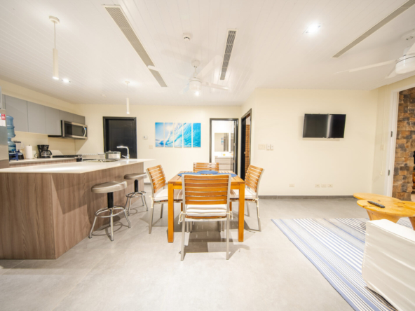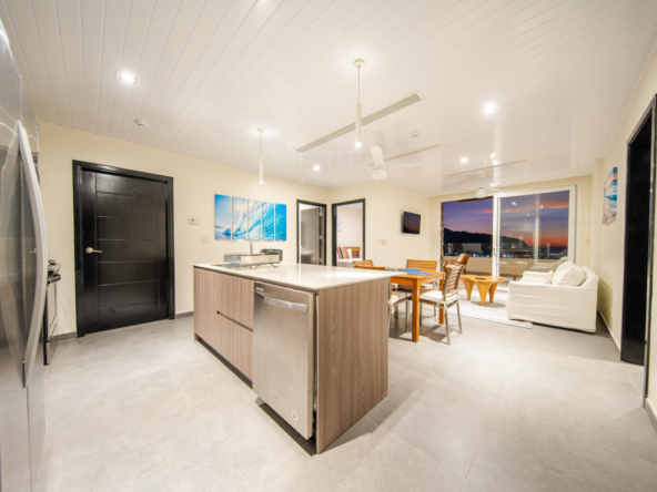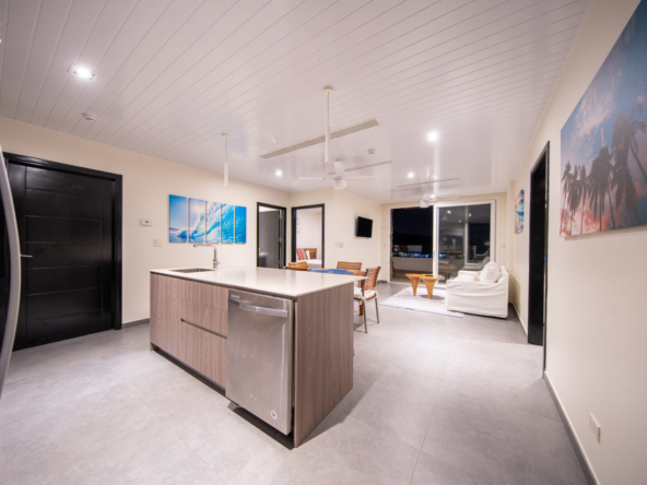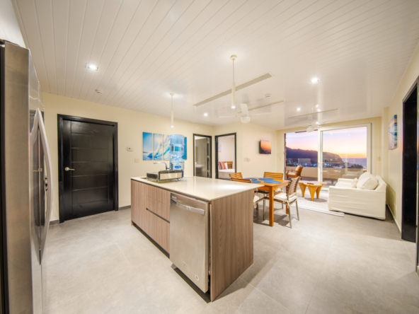 Inside, the open-concept layout is designed for light and flow, featuring floor-to-ceiling glass doors that seamlessly connect the indoor living areas to the ocean-facing terrace. The condo boasts a modern kitchen, two generously sized bedrooms with ocean views, and two stylish, functional bathrooms.