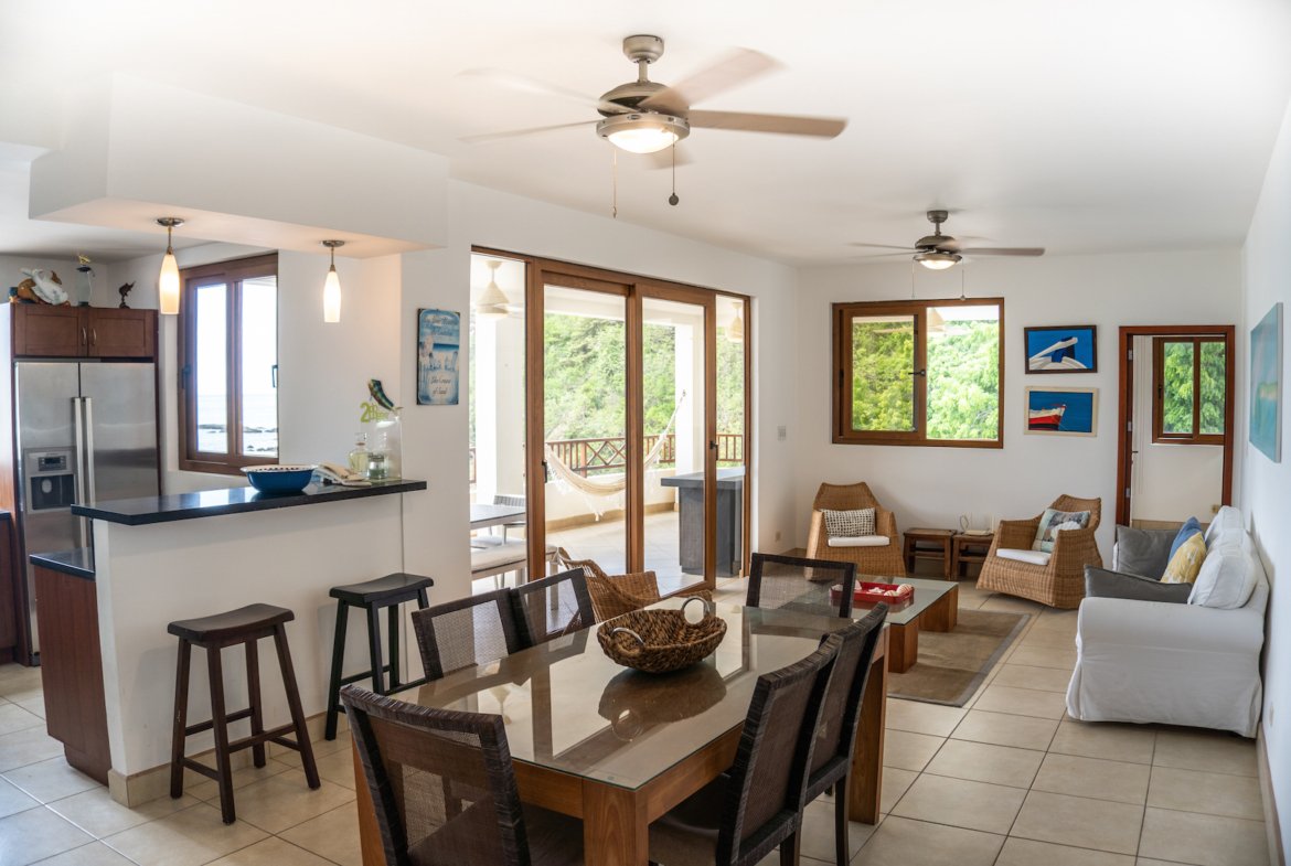 • Bright, open-concept living and dining area with panoramic ocean views