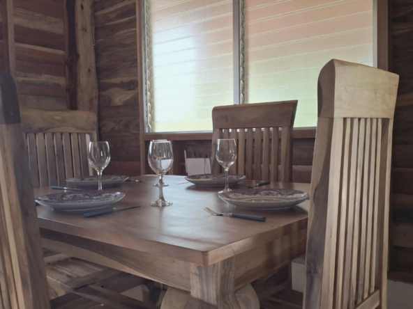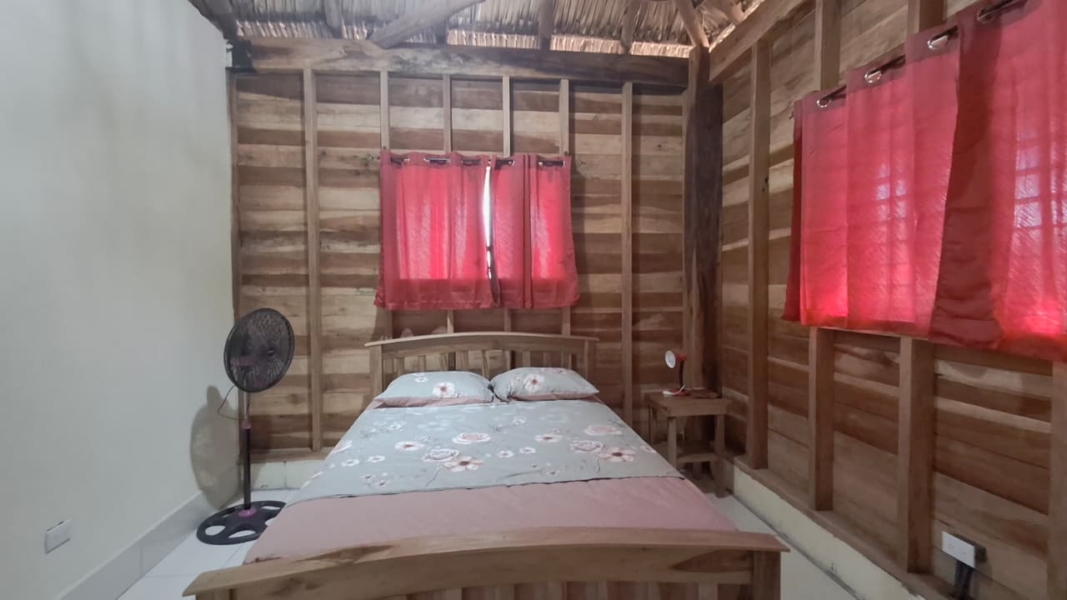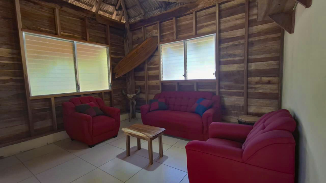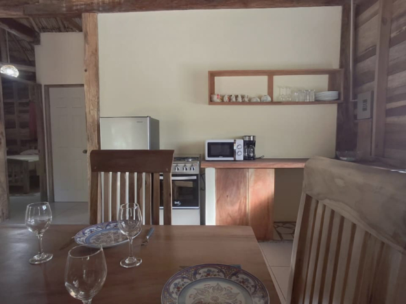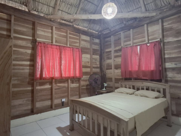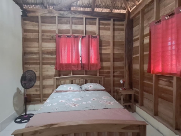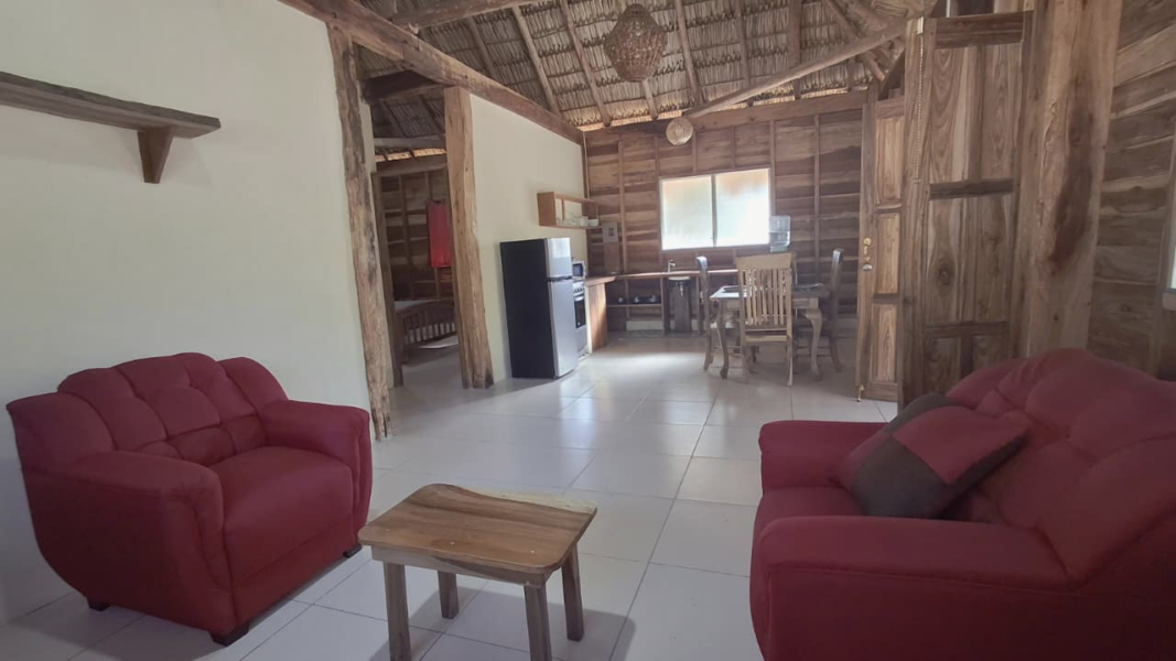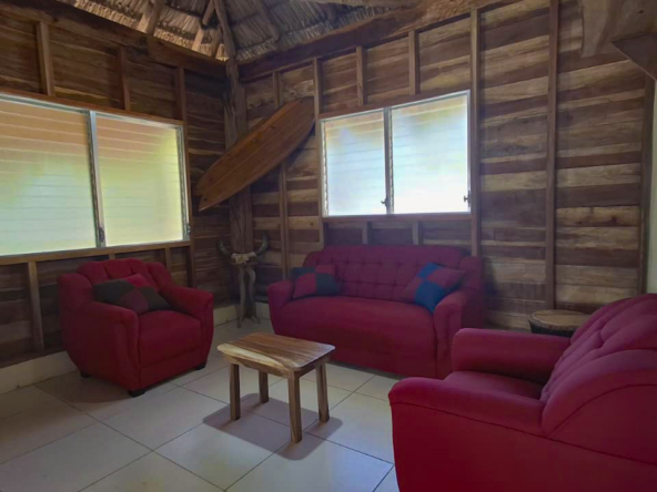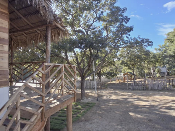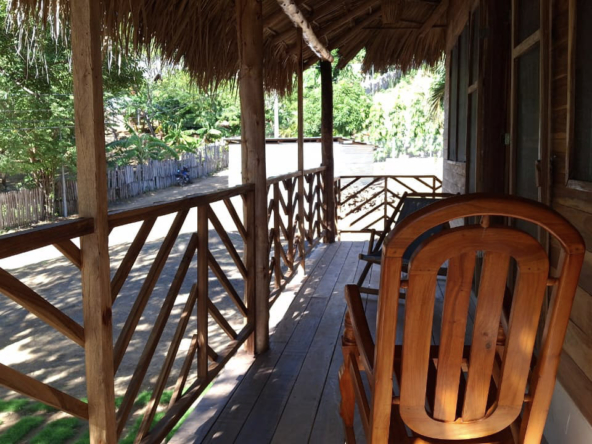 The property features a solid elevated structure on a firm foundation and a palm-thatched roof that adds character while helping to maintain a comfortable indoor temperature. Upon entering the cabin, three steps lead directly to the outdoor terrace, a practical space well suited for everyday use. The design emphasizes functionality and natural ventilation, making it a property well adapted to the coastal environment.