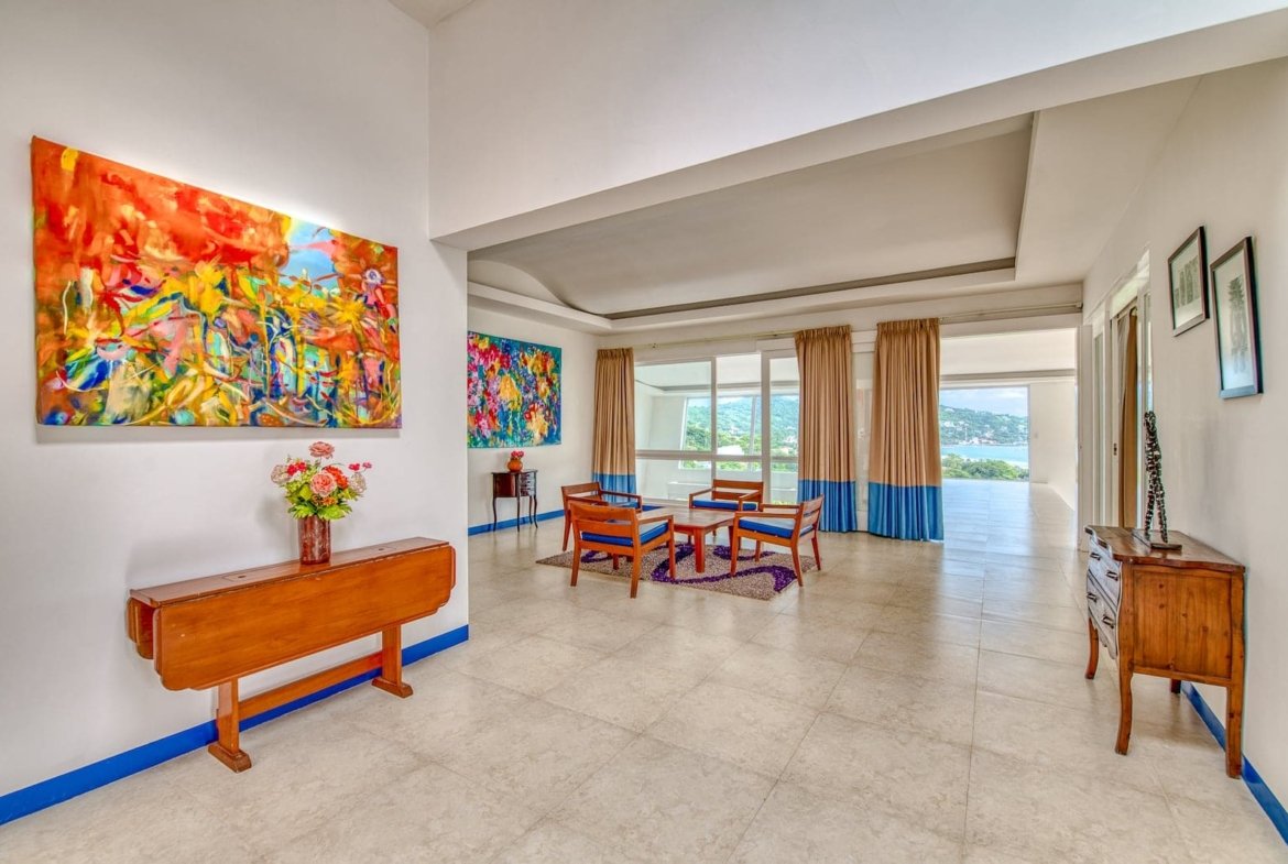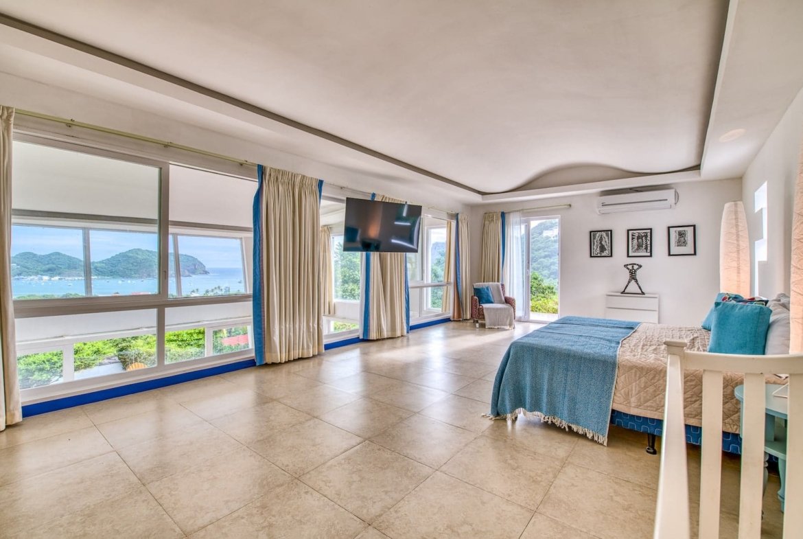 The upper level welcomes you with an oversized primary bedroom, an additional guest bedroom, and a well-appointed bathroom. A generous lounge area connects the rooms and leads to a striking suspended walkway that opens to the far end of the glass-lined southwest façade, offering uninterrupted vistas of the ocean and hills.