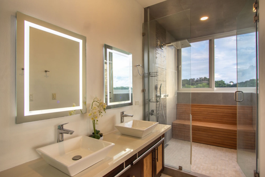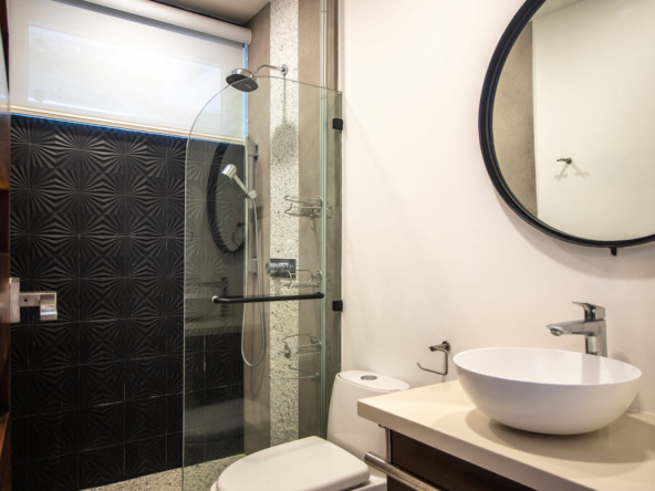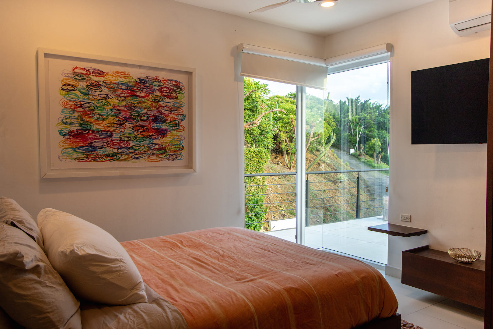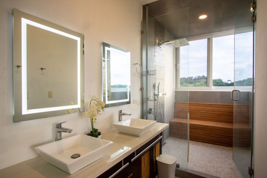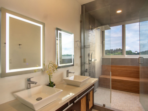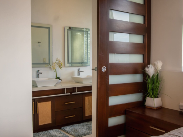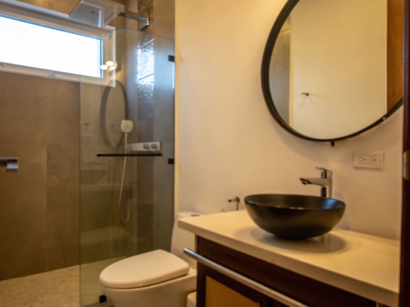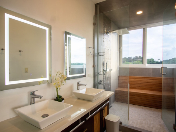 Upstairs, the master suite offers privacy and relaxation, featuring a private bathroom with a modern shower system with personalized water controls and a balcony overlooking the Pacific Ocean, where sunsets paint the sky every evening.