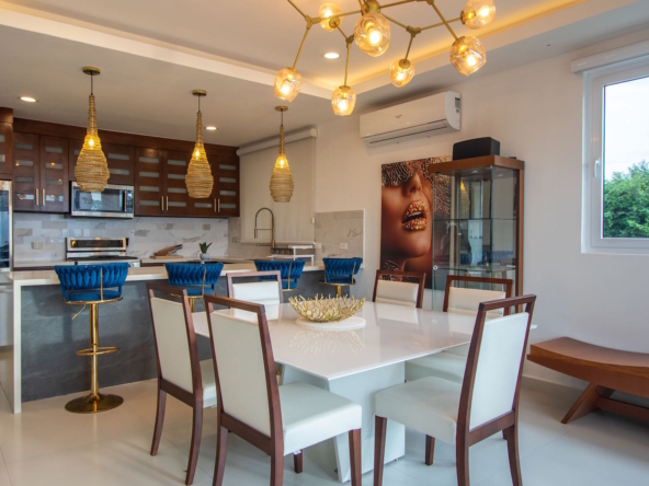 On the main floor, you’ll find a bright open-concept living room and kitchen, beautifully decorated with modern furnishings and elegant wall art that adds a refined touch.