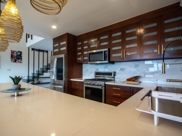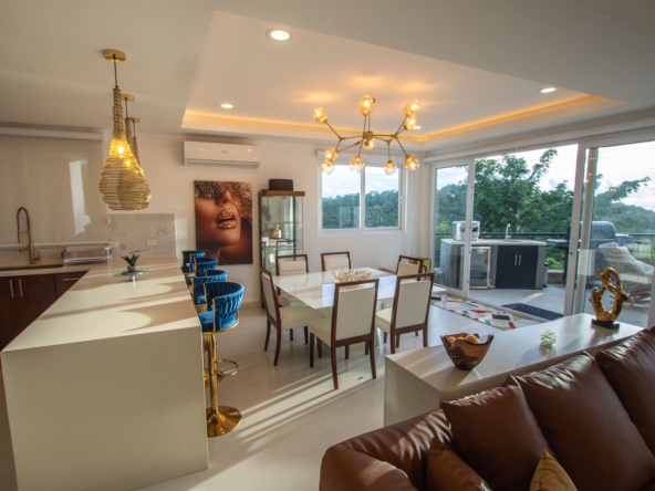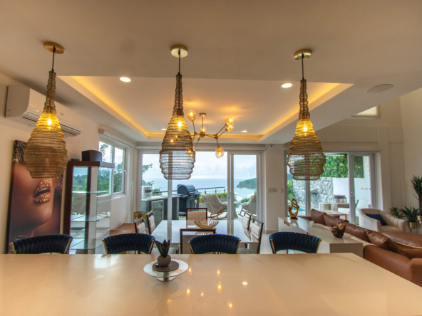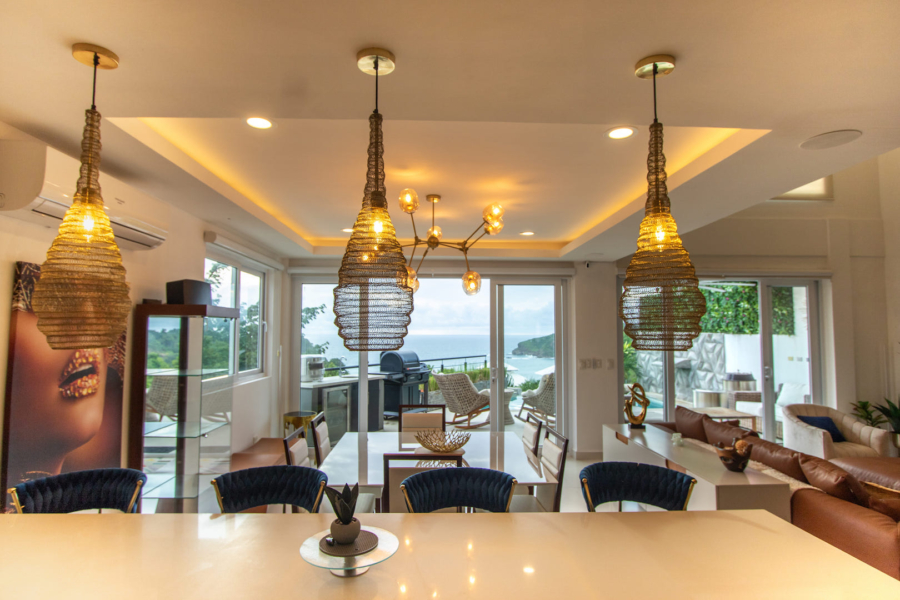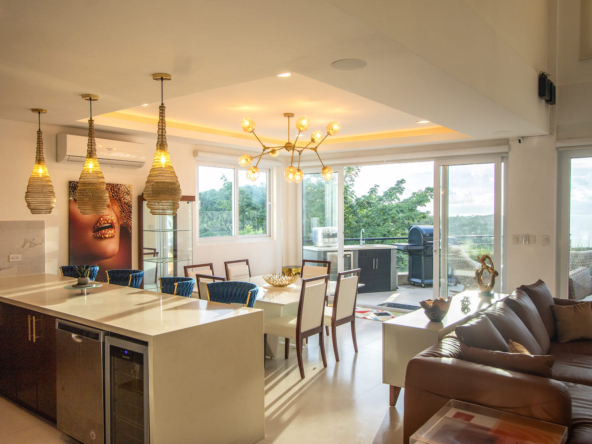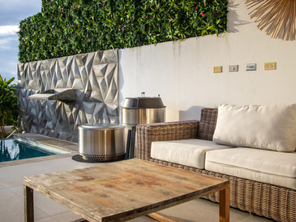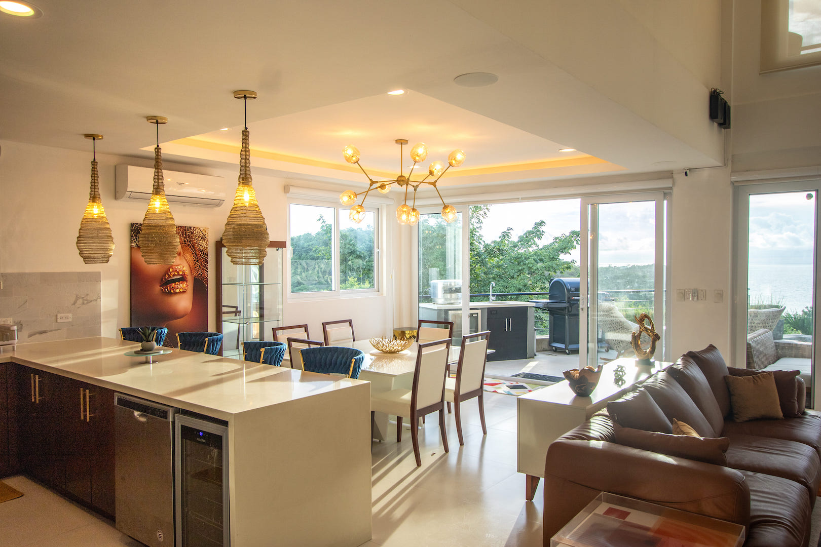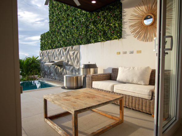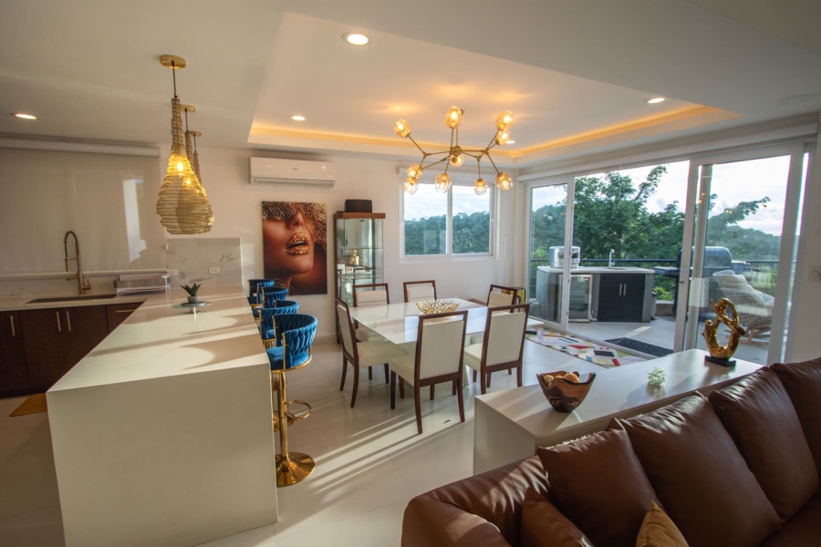 This level also includes a guest bedroom and a full bathroom, plus direct access to the private pool area — complete with a bar, barbecue, and outdoor ovens — perfect for entertaining while enjoying the breathtaking ocean and mountain views.