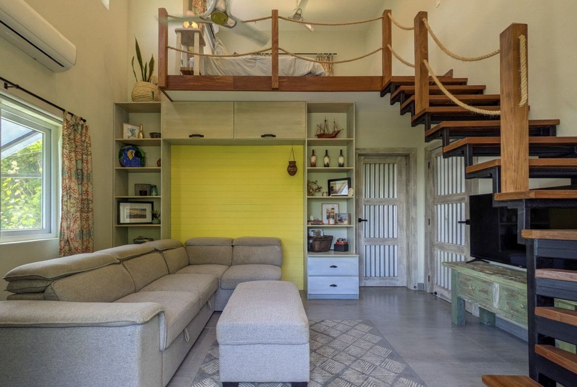 Both bedrooms are positioned on separate ends of the home for superior privacy, each featuring an ensuite bath and mini-split AC units. The current layout uses the loft as the primary suite and the lower room as a den/guest room, offering homeowners flexibility in configuration.