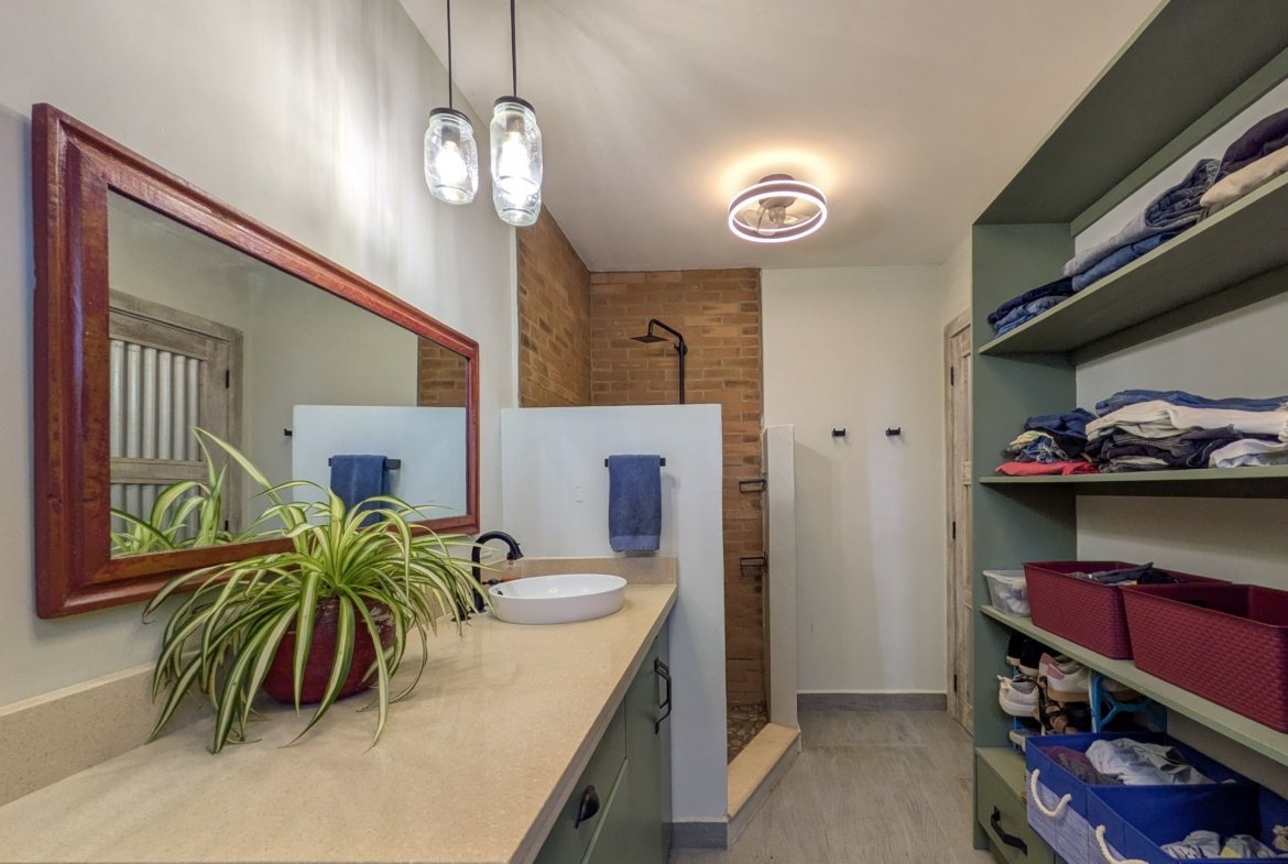 The lower level includes a second shaded terrace with a private dip pool, offering a refreshing spot for cooling down. This area represents excellent investment value: it is already pre-plumbed and wired, making it simple to complete as a third full bathroom and studio or third bedroom, instantly boosting rental capacity. A large, accessible storage area is available for tools, equipment, and beach gear.