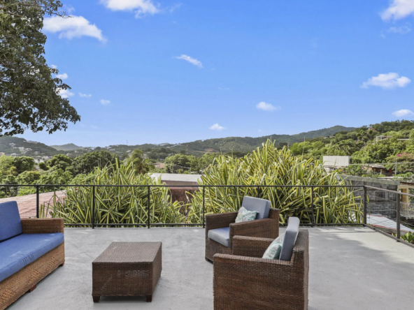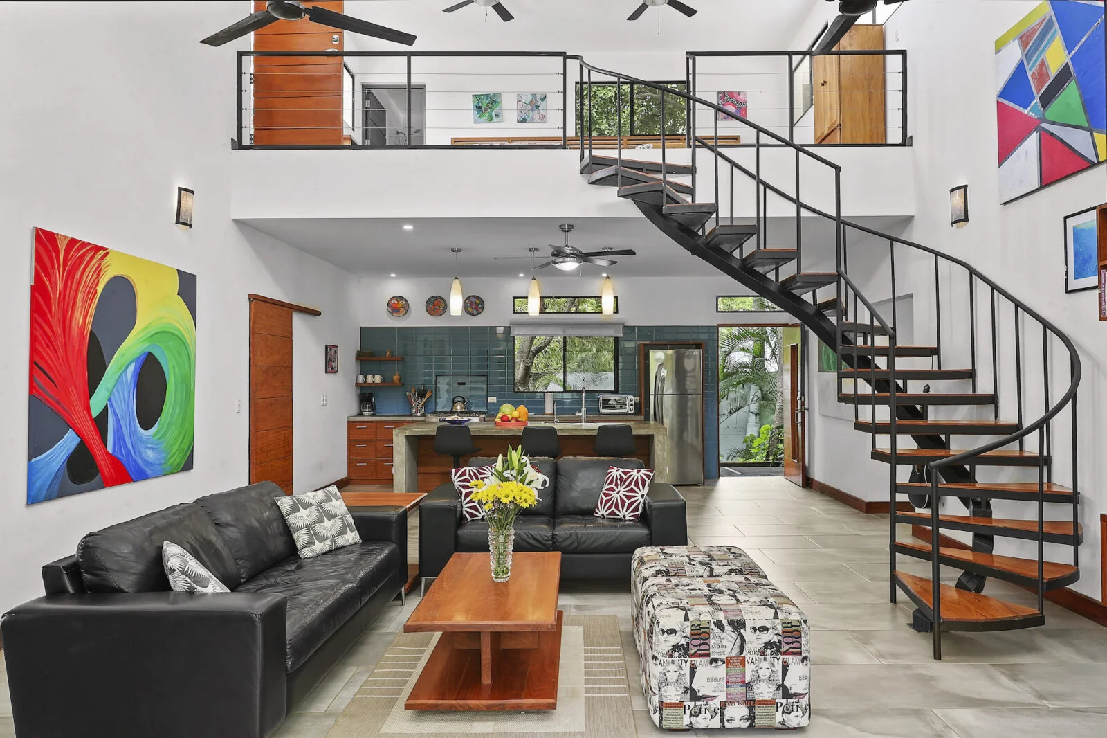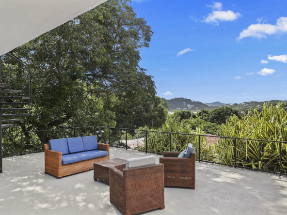 The bedroom layout offers flexibility: two air-conditioned suites with private bathrooms and garden access, plus a separate loft bedroom with its own entrance and bathroom, ideal for guests. Notable property features include a rooftop terrace with Pacific and town views, professionally landscaped gardens with multiple distinct areas, a comprehensive water filtration and storage system, gated parking, a caretaker’s cottage, and ample storage. The home is designed for natural ventilation and security.